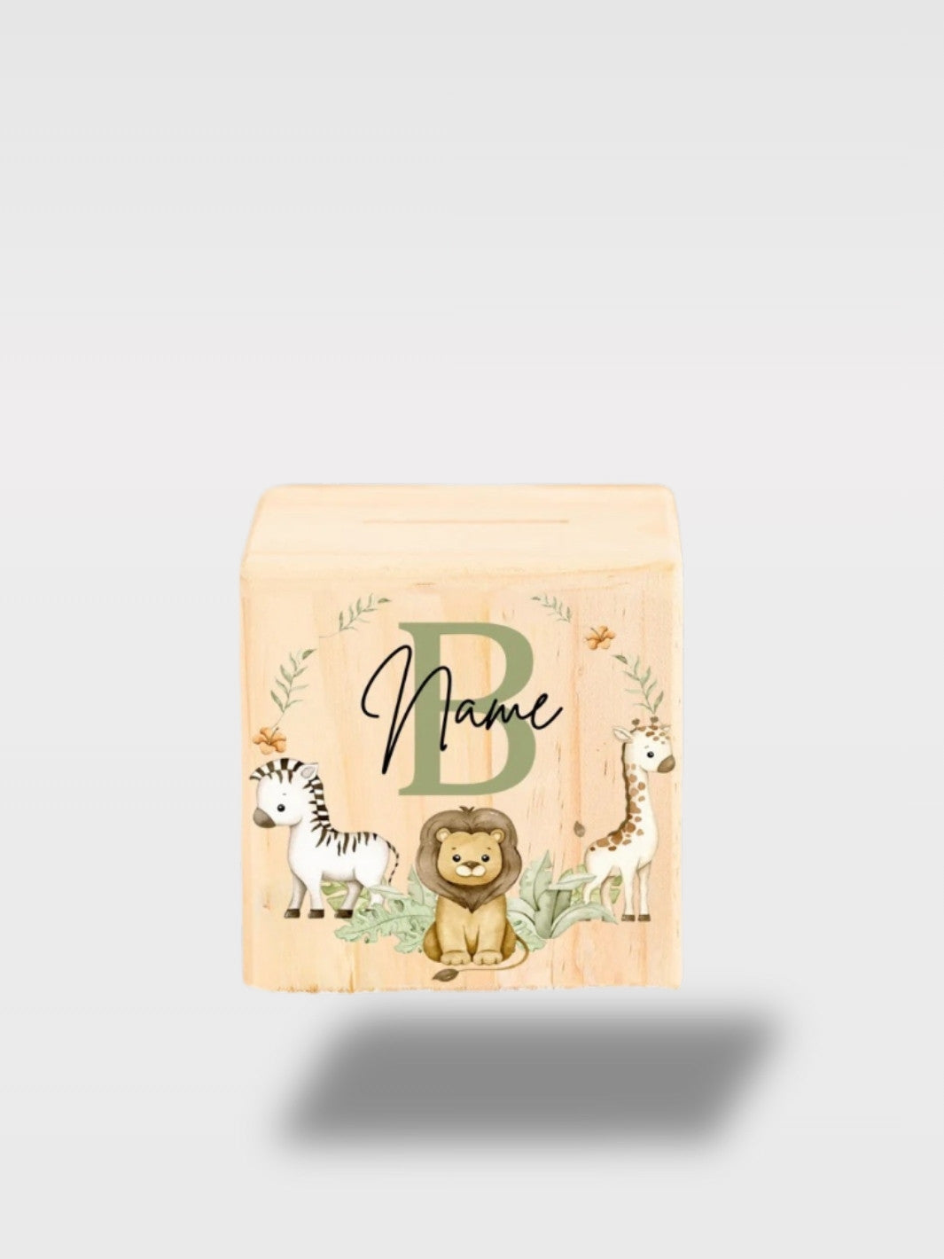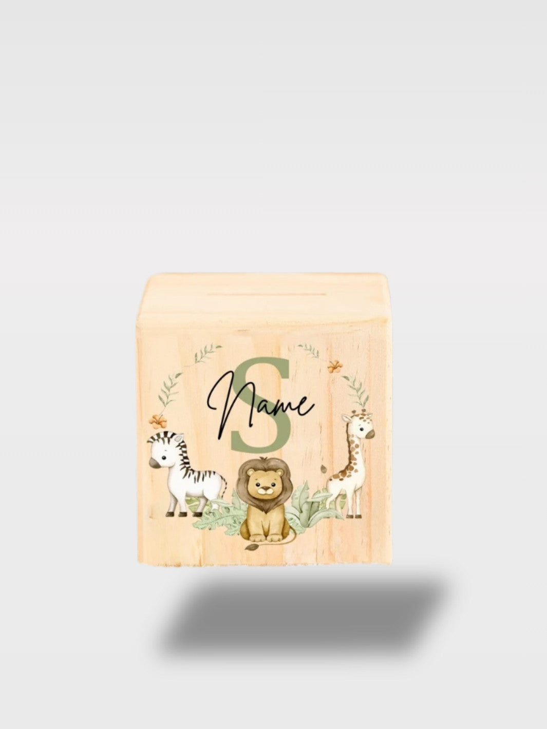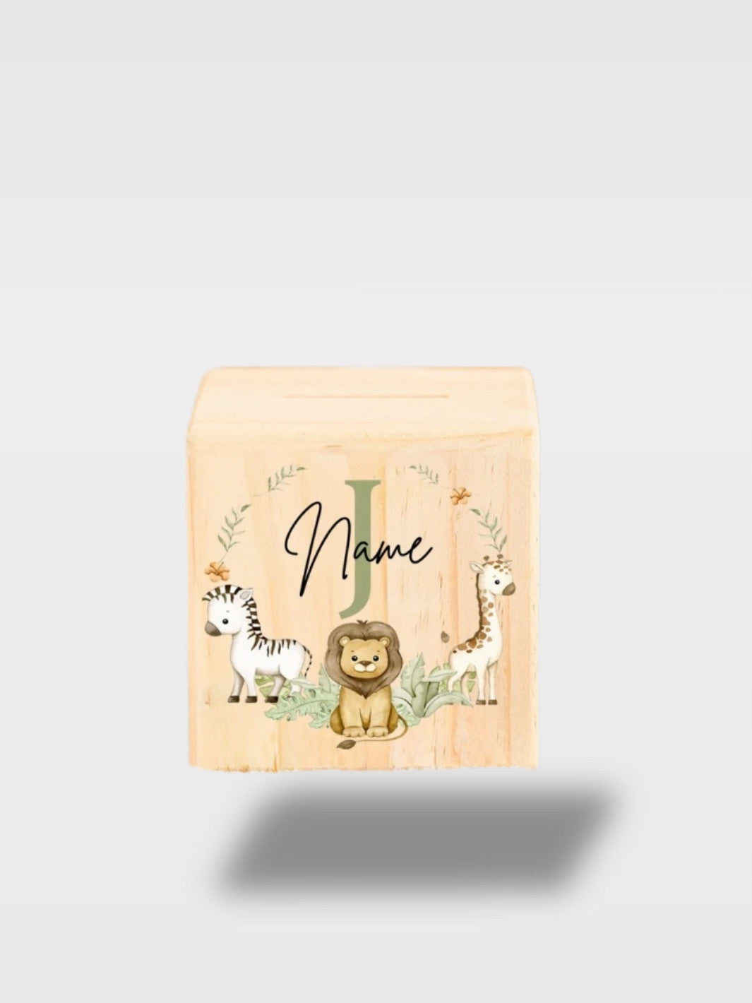 Mon Premier Trésor vous présente une tirelire cube en bois, décorée d’adorables animaux du safari et personnalisable avec le prénom de votre bébé pour un cadeau unique