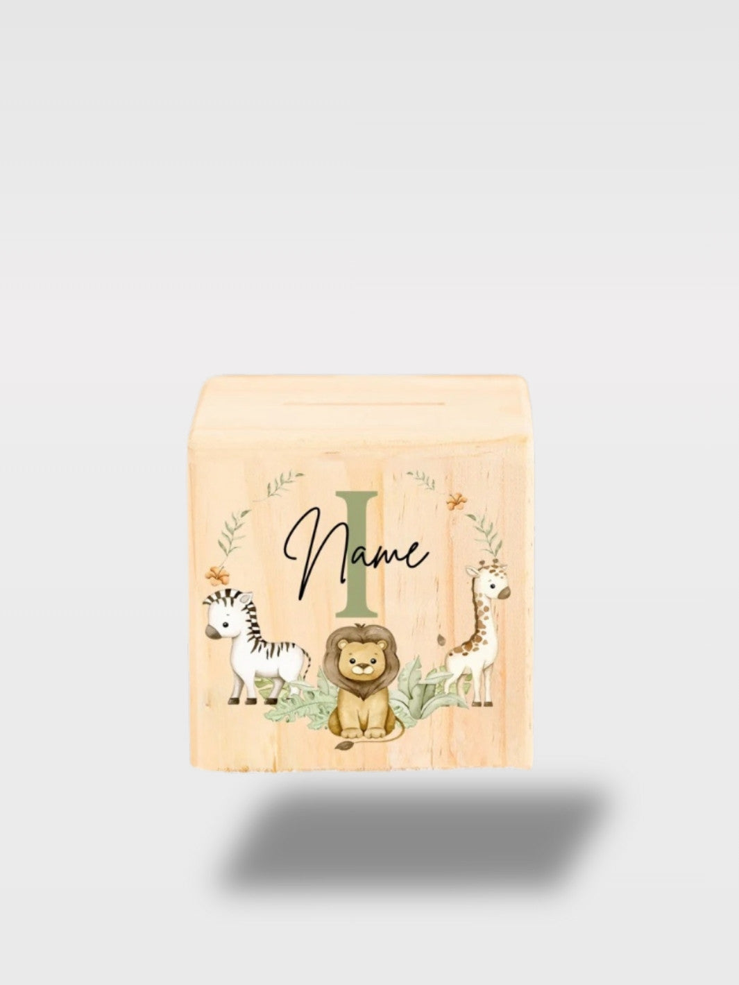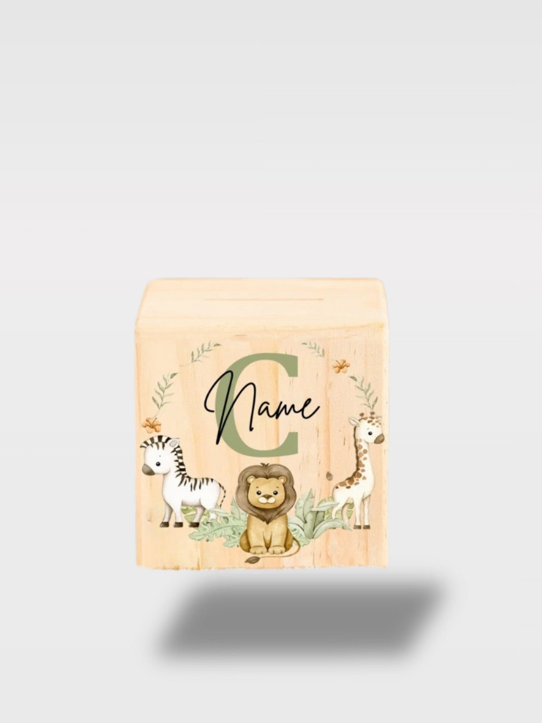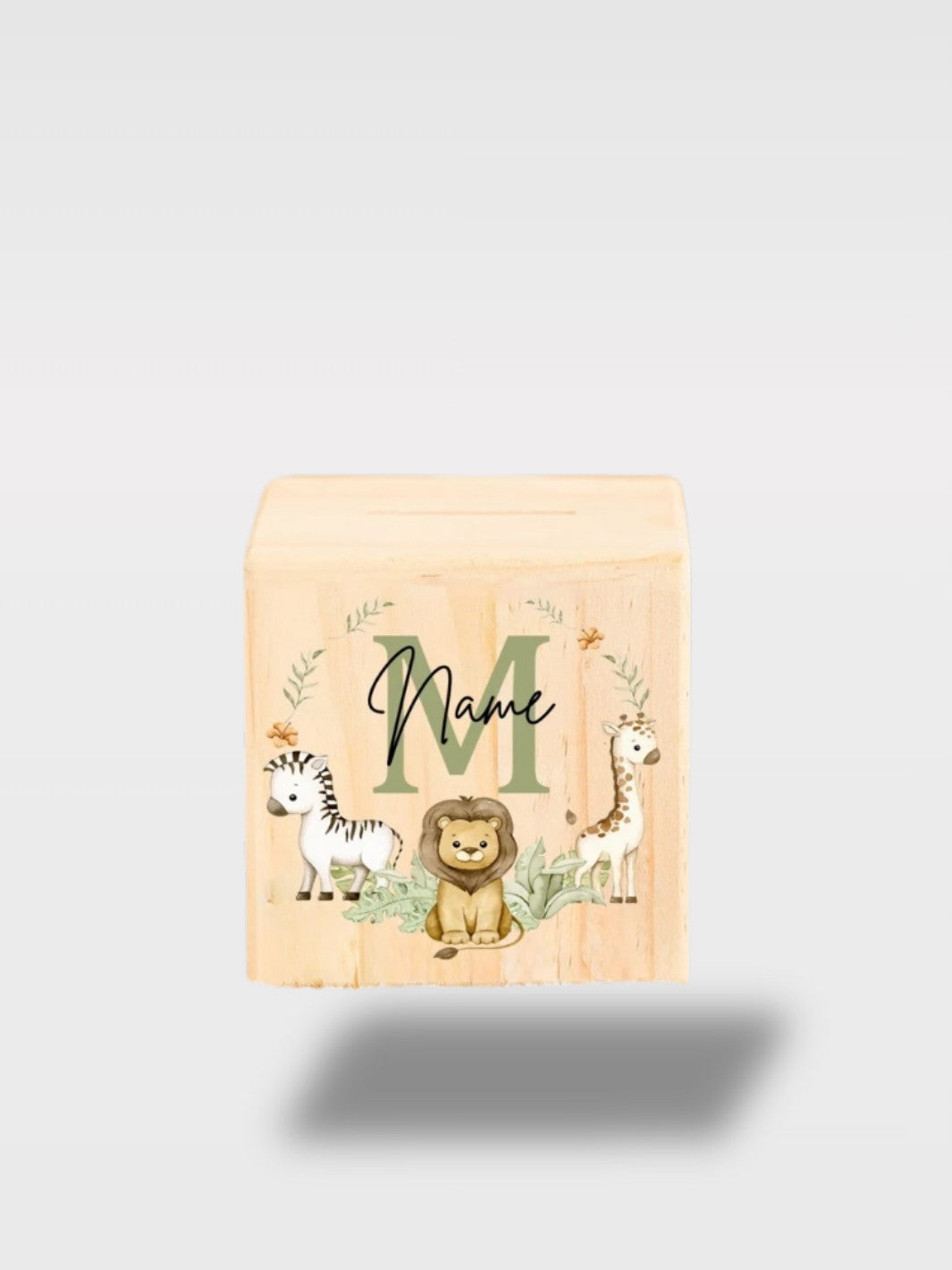 Mon Premier Trésor vous présente une tirelire cube en bois, décorée d’adorables animaux du safari et personnalisable avec le prénom de votre bébé pour un cadeau unique
