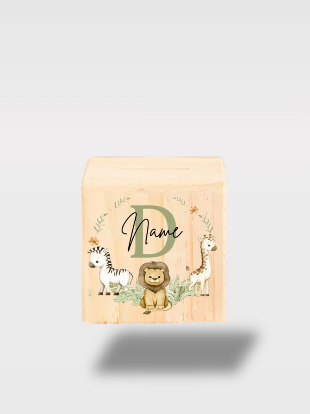 Vous qui aimez les objets à la fois utiles et décoratifs, laissez-vous séduire par cette tirelire bébé personnalisée animaux safari en bois, pratique et décorative. Chaque cube permet de personnaliser avec le prénom et la première lettre en majuscule. Plusieurs variantes disponibles, incluant des animaux comme le lion, le cheval et la girafe. Elle allie plaisir d'épargner et touche de fantaisie, transformant chaque pièce mise de côté en un moment agréable.