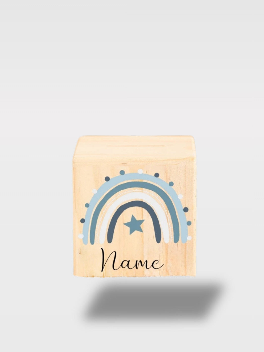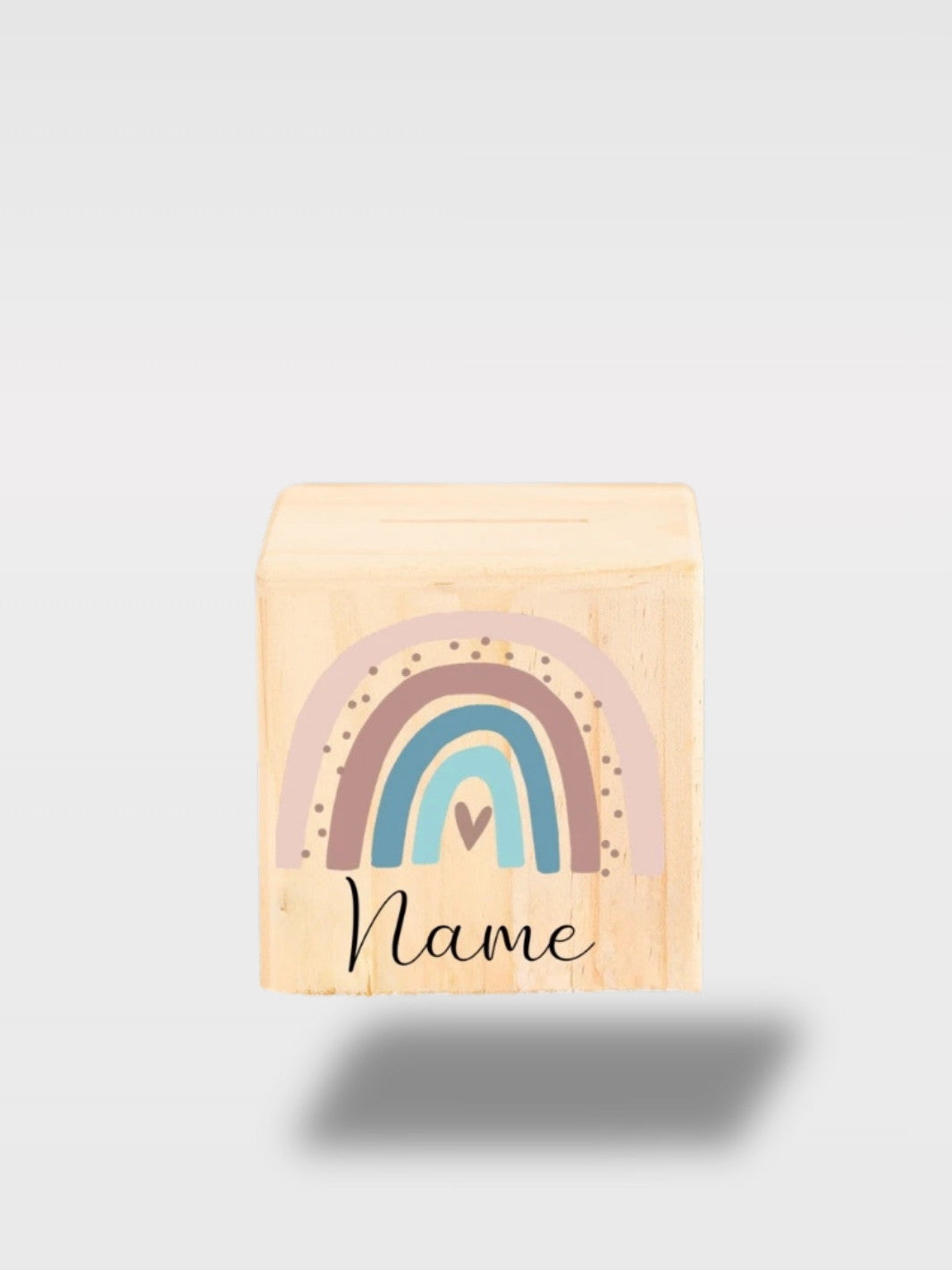 Mon Premier Trésor vous présente une magnifique tirelire cube en bois, ornée d’un arc-en-ciel coloré et personnalisable avec le prénom de votre enfant