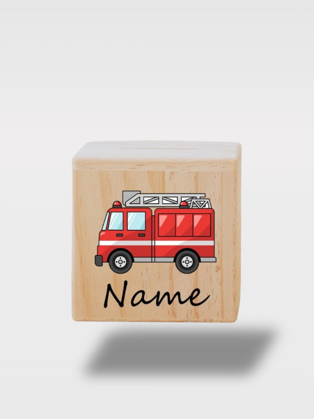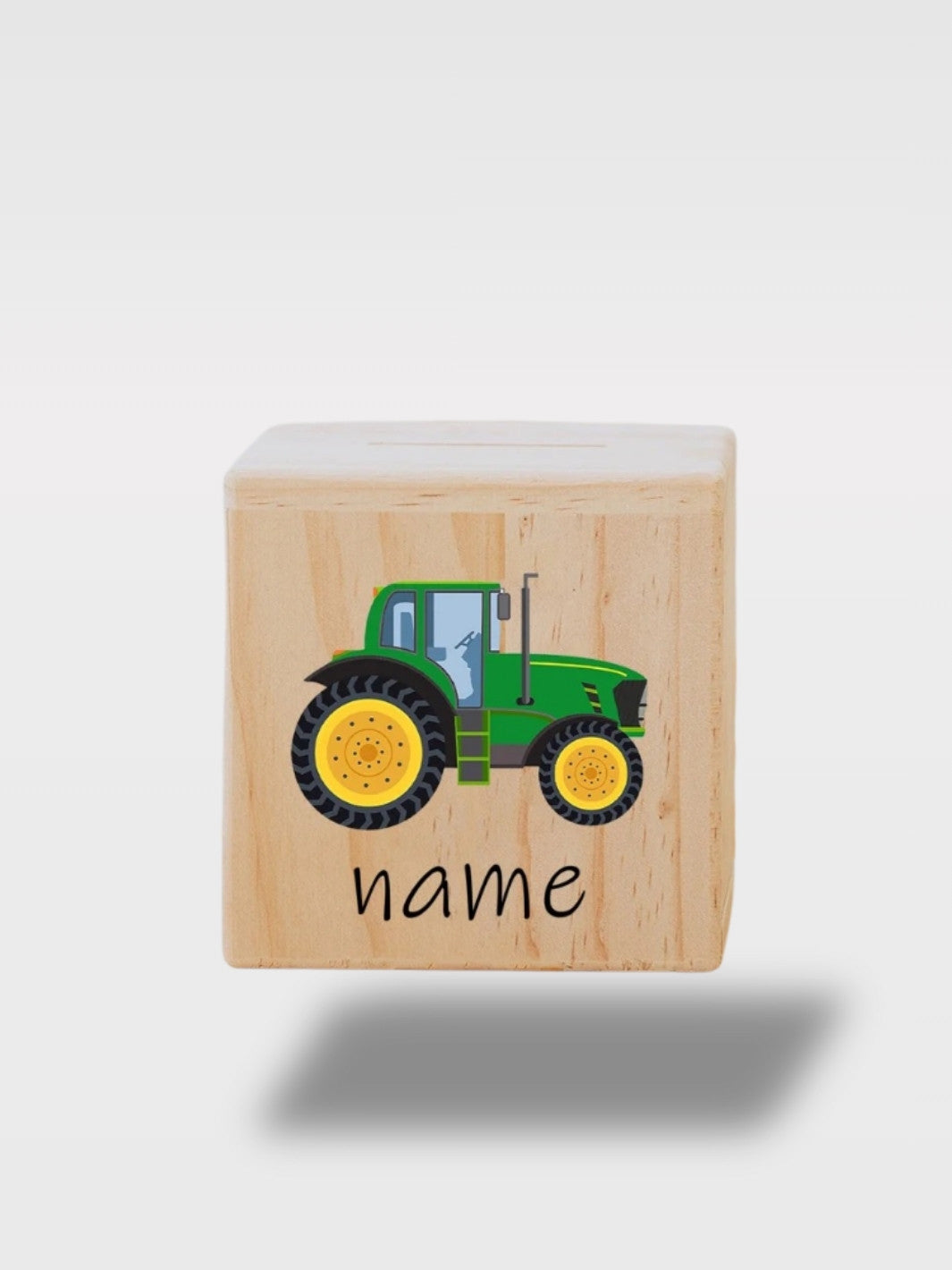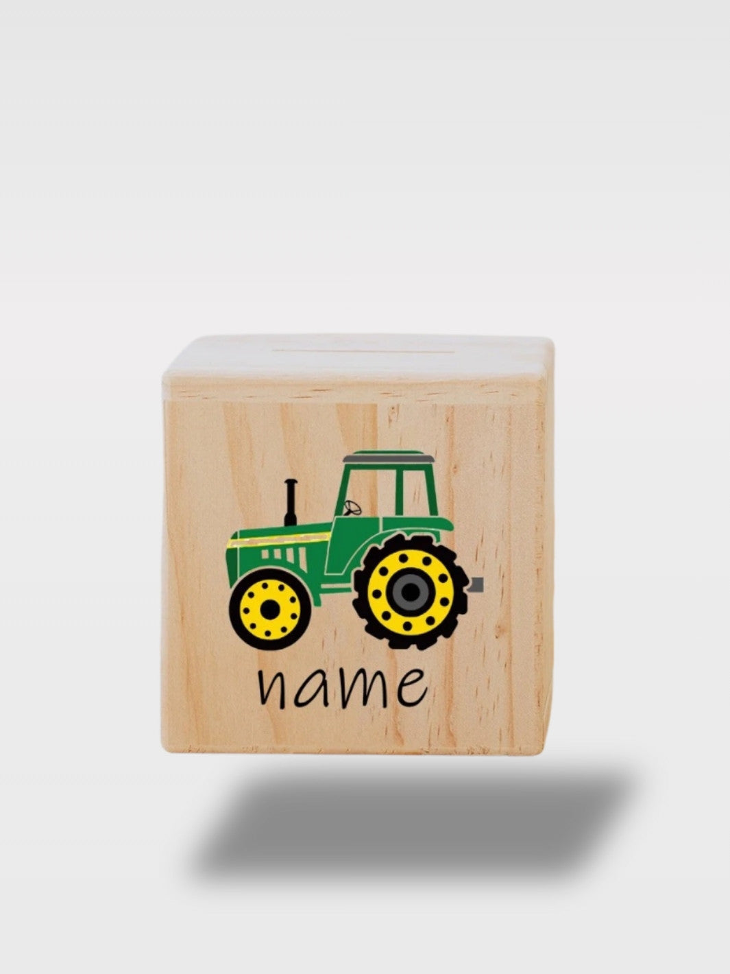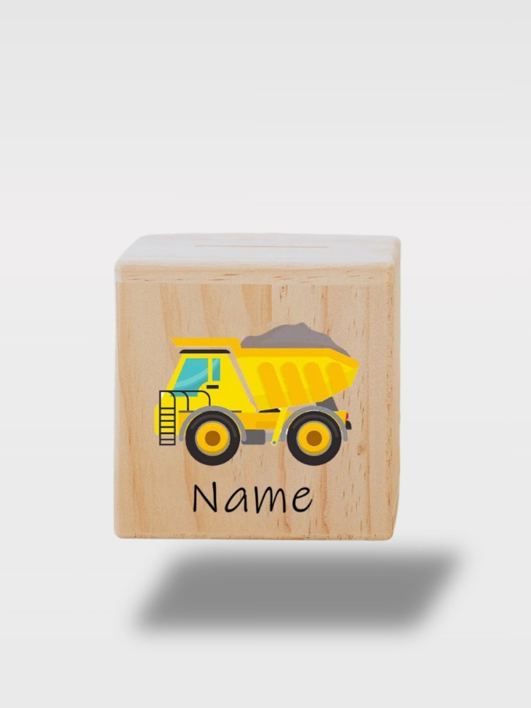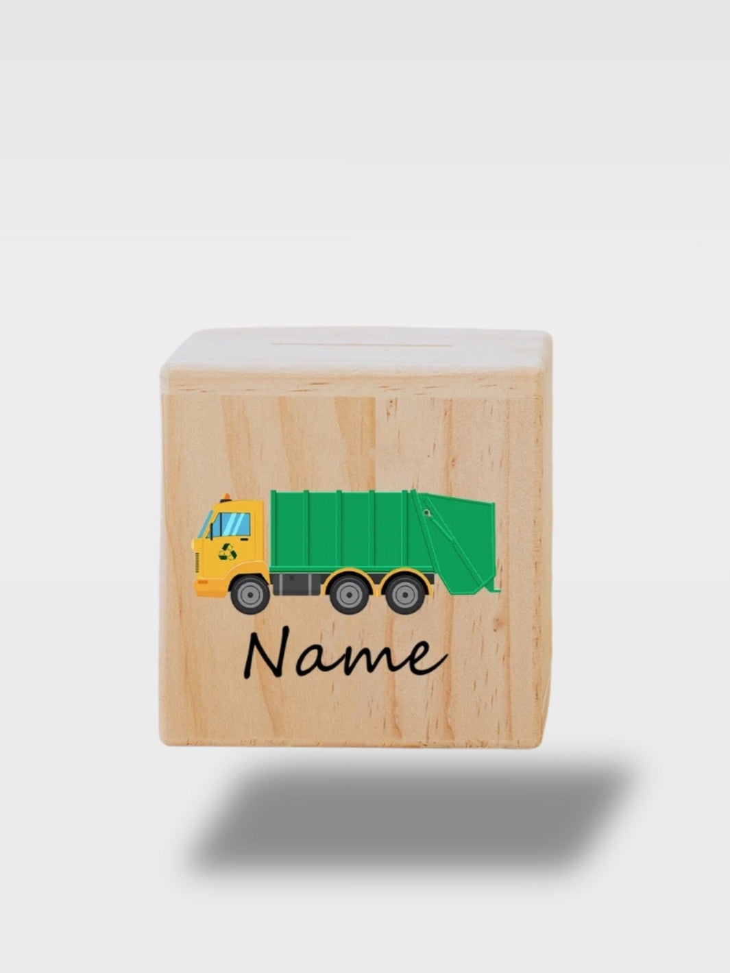Mon Petit Trésor vous présente une tirelire cube en bois personnalisable avec prénom et véhicules ludiques